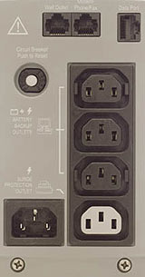 | Рисунок 1. На задней панели ИБП размещены электрические розетки, в том числе розетка для подключения принтера, входная и выходная розетки модемной линии и информационный порт ИБП. |