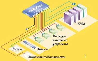 | Рисунок 2 . Пример решения с переключателем KVM (последовательного): Dominion KSX компании Raritan. |