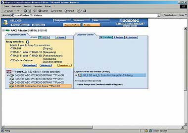 Adaptec, специализирующаяся в области RAID и SCSI, представила свой контроллер 2410SA. Это очень небольшое устройство, как и его коллега производства компании ICP Vortex, устанавливается даже в слоты половинной высоты, и потому к нему прилагается соответствующая заглушка для слота. Сходство наблюдается также в том, что загрузочный компакт-диск проводит пользователя через процедуру создания дискет с драйверами и открывает доступ к конфигурационной BIOS. Построение BIOS типично для продукции Adaptec и разграничивает параметры массива и контроллера. Создание массивов проходит просто и быстро, «горячий» резерв выбирается при помощи комбинации клавиш . После перезагрузки сообщение BIOS уже показывает инициализированный накопитель. В случае Windows 2000 и 2003 драйверы инсталлировались без проблем, установка программного обеспечения управления также не составила труда. Adaptec использует IIS и конфигурирует порт 3513 для доступа ко всем функциям контроллера — с шифрованием данных при помощи протокола защищенных сокетов (Secure Sockets Layer, SSL). Стоит отметить следующее: для входа в систему программное обеспечение управления требует ввода действительной комбинации «имя пользователя/пароль» для доступа к серверу.