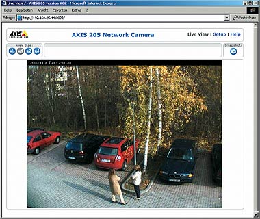 Сразу же после запуска камера должна показать снимаемую картинку (Motion JPEG) на своей начальной странице (см. Рисунок 1). Пользователям Internet Explorer от Microsoft при первом обращении придется загрузить с камеры компонент Active X (стандартная установка; в качестве альтернативы возможно применение апплета Java), в случае Netscape Navigator поток доставляется посредством техники принудительной доставки (Server Push). Необходимые отдельные кадры в формате JPG могут быть извлечены при помощи функции моментального снимка и сохранены, к примеру, на локальном жестком диске. Возможности меню настройки очень наглядны, но не слишком обширны. Это вполне соответствует ограничению общей функциональности продукта самым необходимым.