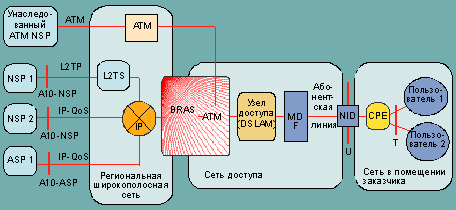 Топология сети DSL с поддержкой качества услуг IP.
