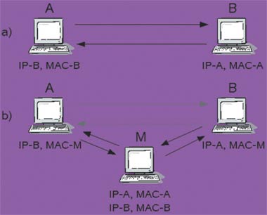 Теперь любая коммуникация между А и В проходит через М. Пока М не предпринимает никаких действий, эта ситуация не заметна ни для А, ни для В. Если А и В не являются обычными хостами в сети, т. е., к примеру, А — это персональный компьютер, а В — маршрутизатор подсети, создается пикантное положение, когда М может читать трафик А в полном объеме, включая трафик Internet. Это прослушивание распространяется на все — от паролей до персональных данных. Предположительно безопасные соединения по протоколу SSL, который в случае защищенных страниц Web используется, в частности, при интерактивных банковских операциях, или по протоколу SSH — для организации шифруемого сеанса с сервером — при определенных обстоятельствах также могут просматриваться атакующим.