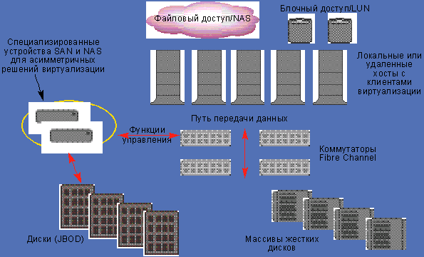 При асимметричной архитектуре все управляющие процессы извлекаются из регулярного потока данных между хост-серверами и системами хранения и обрабатываются специализированными устройствами виртуализации.
