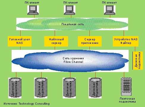 Гетерогенная сеть хранения данных с элементами SAN, NAS и NAS Head. Коммутаторы в SAN не обозначены.