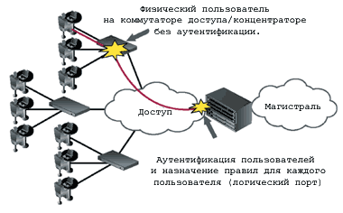 | Рисунок 2. Многопользовательская аутентификация и правила дополняют аутентификацию пользователей на границе сети такой же аутентификацией в ее ядре. |