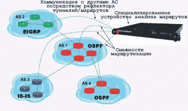 Рассмотренная нами технология может быть распространена на многопротокольную коммутацию меток (Multi-Protocol Label Switching, MPLS) и сегменты виртуальных частных локальных сетей (Virtual Private LAN Segment, VPLS). Специализированное оборудование анализа маршрутизации IP применимо и для централизованного администрирования во внешних сетях независимых доменов маршрутизации, которые часто конфигурируются посредством протоколов маршрутизации EIGRP, IS-IS или OSPF. И поскольку это смежное оборудование предназначено для сбора информации о маршрутизации, с его помощью администратор сумеет управлять маршрутизаторами во внешних сетях.