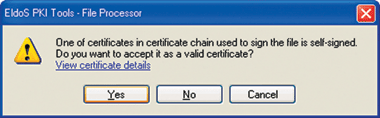 | Рисунок 1. Инструментарий PKI от Eldos не позволяет бездумно предпринимать рискованные действия: в данном случае система заявляет о не заслуживающем доверии сертификате. |