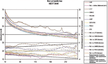 Численные значения характеристик переходной помехи, полученные с помощью отдельных образцов приборов, изображены на Рисунках 3, 4 и 5. В качестве опорных значений использовались нормы уровня точности III и показания сетевого анализатора. Показания DSP-4100, Framescope 350, Lanmaster 600 и DTX-1800 не выходят за пределы разрешенных допусков. В случае DSP-4100 на частоте 240 МГц характеристика пересекает нижнюю границу разрешенных допусков.