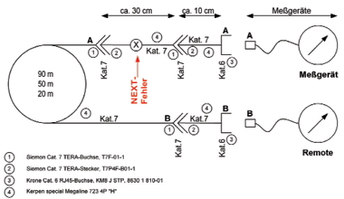 В качестве объекта измерений служила часто применяемая в реальных кабельных системах стационарная линия, в данном случае из горизонтального кабеля Megaline 723 Категории 7 производства Kerpen и соединительных розеток KM8 компании Krone. На одном из концов находился макет участка с пониженным переходным затуханием. Для этого через штекерный разъем Категории 7 к стационарной линии подключался поврежденный горизонтальный кабель длиной 30 см. На его конце снова устанавливался разъем Категории 7.