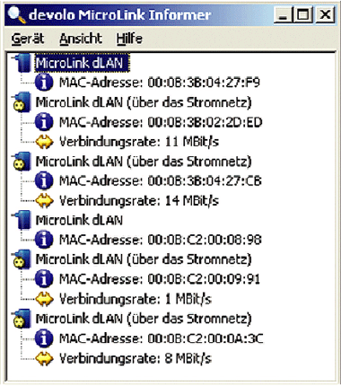 Devolo предоставила три адаптера типа Mikrolink D-LAN Ethernet. Производитель предлагает также адаптеры Powerline для WLAN и USB, Mikrolink D-LAN-I в прочном металлическом корпусе для промышленного применения, Mikrolink D-LAN Audio для «удлинения» кабелей динамиков и прослушивания файлов MP3. Адаптер Ethernet оказался наиболее компактным решением из тестируемых, кроме того, Devolo поставляет вместе с ним богатую коллекцию программных утилит, куда включены ассистент конфигурации, Programm Easy Share и Devolo Informer.