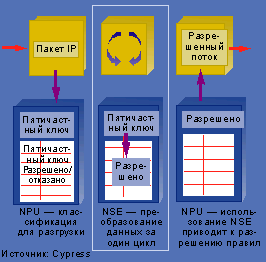 На рисунке 2 поясняется функциональность NSE на примере приложения разрешения правил. Здесь процессор пакетов (ASIC, FPGA или NPU) должен решить, может пакет пройти через сеть или нет. Для переноса этой многоцикличной функции процессор пакетов на основании заголовка IP-пакета составляет пятичастный ключ, однозначно идентифицирующий поток пакетов, и отсылает его NSE. Ключ состоит из следующих элементов: