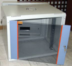 Емкость настенных шкафов чаще всего небольшая (от 3 до 20U по высоте и от 300 до 600 мм по глубине), и применяются они для организации небольших узлов (см. Рисунок 3). Самая простая конструкция настенных шкафов - двухсекционная (с открывающейся передней дверью). Если необходим доступ к оборудованию сзади, то в этом случае можно приобрести трехсекционные шкафы (с поворотной задней секцией), а как альтернативу - двухсекционные шкафы с поворотными или выдвижными монтажными рамами (см. Рисунок 4). Варианты конструкции могут предусматривать съемную заднюю и боковые стенки.