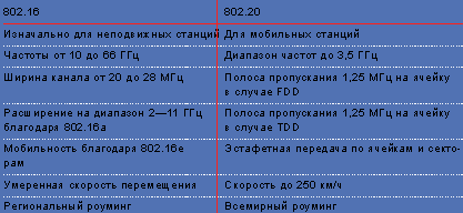 Таблица 1. Отличия IEEE 802.16 от IEEE 802.20.