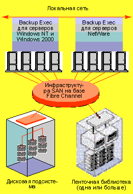 Если резервное копирование вызывает неприемлемое падение производительности локальной сети, то на помощь приходят различные концепции хранения. Так, сеть хранения не только разгружает основную сеть, но и помогает эффективно использовать аппаратное обеспечение, если соответствующее ПО обладает функцией, с помощью которой несколько распределенных серверов резервного копирования может совместно использовать централизованные устройства хранения (см. Рисунок 3). Альтернативой (либо дополнением) является сетевые устройства хранения данных (Network Attached Storage, NAS). При этом программное обеспечение должно быть либо совместимым с серверным специализированным комплектом Microsoft (Server Appliance Kit, SAK), либо предлагать поддержку для NAS посредством соответствующих расширений, например протокола управления данными в сети (Network Data Management Protocol, NDMP).