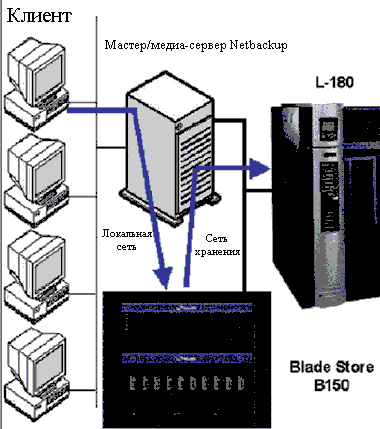 | Рисунок 1. Комбинация резервного копирования на базе диска и магнитной ленты: во время резервного копирования подлежащие сохранению данные передаются от клиента на Netbackup Media Server, где они записываются на жесткий диск. Затем образ для резервного копирования дублируется с диска на магнитную ленту. |