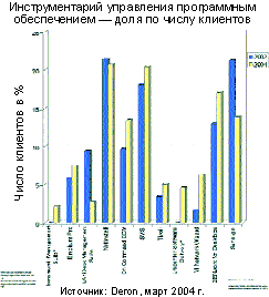 Deron опубликовала в марте 2004 г. обширный отчет по результатам анализа рынка управления клиентами. Более 5500 немецких предприятий всех размеров представили данные о своем опыте и удовлетворенности работы с соответствующими инструментами. По числу заявок спрос на Microsoft SMS и Novell ZENworks снижается, а по числу управляемых клиентов наиболее востребованы Netinstall от Netsupport, SMS и ZENworks (см. Рисунок). Заметно сократилось количество «прочих» продуктов, т. е. собственных разработок и инструментов, выпускаемых небольшими компаниями-производителями, что свидетельствует о растущей стандартизации на этом рынке. Самые лестные отзывы получили решения от Baramundi, Matrix42, Voelcker Informatik, Novell и Landesk. Однако для новичка Baramundi опубликованные данные базируются на весьма ограниченном количестве отзывов.