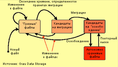 Сегодня очень многие компании рекламируют ILM. В каждом отдельном случае необходимо тщательно подбирать продукт с учетом потребностей предприятия. Так, базовой функцией Infinistore Archive Filer (IAF) от Grau Data Storage является объединение преимуществ двух носителей: скорости жестких дисков и надежности магнитных лент. При этом процессы внутри системы протекают следующим образом: файлы с высокопроизводительных дисков автоматически переносятся на другой, более дешевый носитель в соответствии с заранее определенными критериями (правилами), к которым относятся, например, возраст файла, дата создания, размер или тип файла (см. Рисунок 1). После успешной миграции остается лишь один метафайл, содержащий ссылку на новое месторасположение данных. Сам пользователь не заметит произошедших изменений и будет разыскивать файл прежним способом. В таком случае говорят о прозрачной миграции.