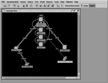 Управление коммутаторами возможно как через интерфейс командной строки (Command Line Interface, CLI), так и при помощи инструментов сетевого управления. Для этой цели в Cisco разработано специальное программное обеспечение Cluster Management Suite (CMS) — инструмент управления на базе Web для конфигурации и устранения ошибок до 16 коммутаторов Catalyst с одним общим IP-адресом (см. Рисунок 2). Специальные ассистенты для компонентов стека позволяют конфигурировать на всех его портах один и тот же профиль. В наличии имеются готовые ассистенты для таких функций, как данные, голос, видео, широковещание, маршрутизация внутри виртуальной локальной сети и безопасность.