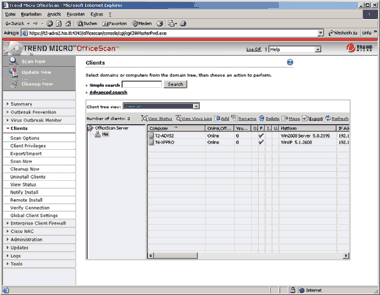 | Рисунок 1. Интерфейс работы с антивирусным программным обеспечением OfficeScan от Trend Micro: управление клиентами. |