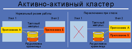 В активно-активных кластерах все машины постоянно загружены. В случае сбоя функционирующий сервер берет на себя выполнение задач отказавшего.