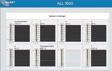 Пример с ориентацией на инженерные системы можно найти у Allnet в семействе продуктов All3000 (под девизом «Включать и выключать по IP и по радио»). Центром переключения на базе IР является в этом случае блок управления All3000RF, при помощи которого можно переключать до 16 розеток. В рамках семейства доступны радиорозетки для внешнего и внутреннего применения, а также радиовыключатель для скрытой проводки. Радиотехникой задействуется нелицензируемый в Европе диапазон 433 МГц, причем максимальный радиус действия в условиях прямой видимости достигает 30 м. All3000RF предлагает, кроме того, интегрированные часы реального времени для управления процессами переключения, а также интерпретатор сценариев. Не было обойдено вниманием и измерение: All3000 Ethernet Sensormeter (см. Рисунок 2) поддерживает до восьми внешних датчиков; с их помощью отслеживаются температура, влажность воздуха и атмосферное давление в разных местах (радиус действия до 100 м). Sensormeter отображает измеренные значения в браузере или отсылает оповещение по электронной почте. Вместе с All3000 датчики могут использоваться для управления положением переключателей.