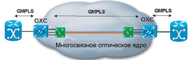 Конструирование трафика — это механизм, при помощи которого определенные пакеты следуют по заранее указанному маршруту в сети. В оптических сетях для маркировки пакетов данных используется модифицированный вариант MPLS — обобщенная многопрофильная коммутация меток (Generalized Multiprotocol Label Switehing, GMPLS). С его помощью становится возможным резервирование пропускной способности в любом месте оптической сети. GMPLS делится на уже описанную оптическую плоскость управления и плоскость данных, или транспортную, предназначенную для регулирования передачи данных. Преимущество его в том, что он поддерживает такие виды передачи данных, как IP, TDM, SDH и DWDM. Иными словами, в отличие от MPLS этот протокол позволяет управлять оптическими волокнами или длинами волн. GMPLS является функцией плоскости управления. Тем самым протокол GMPLS распространяет традиционную маршрутизацию MPLS, сигнализацию и управление на сетевые компоненты транспортного уровня (см. Рисунок 3). Его появление стало возможным благодаря разработке настраиваемых лазеров и коммутации длины волны. Если в случае MPLS конструирование трафика предусмотрено только для передачи, ориентированной на пакеты, то при помощи GMPLS провайдеры услуг могут строить сквозные сети, где будут учитываться все возможные типы передачи, включая DWDM и SDH. Таким образом, GМPLS становится незаменимым для управления и конфигурирования различных сетевых технологий.