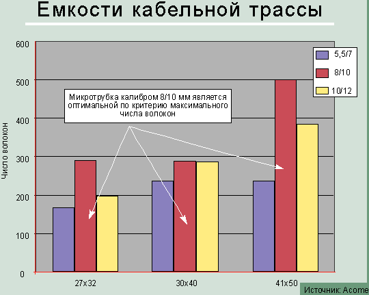 Максимальная емкость каналов кабельной канализации в зависимости от их внутреннего диаметра.