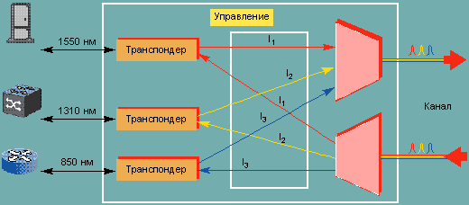 Структура системы волнового мультиплексирования LambdaDriver от MRV. Транспондер принимает оптический сигнал и переводит его в одну из цветных длин волн, затем отправляет «раскрашенный» сигнал на пассивный мультиплексор, передающий его по одному волокну. Приемный демультиплексор разделяет сигнал по длинам волн и передает на транспондер.