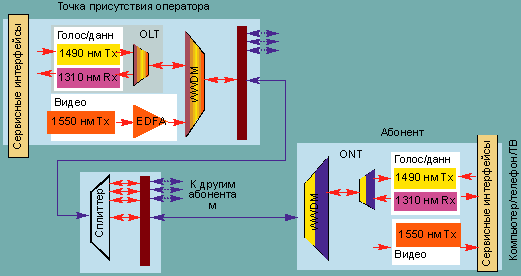 В PON одно устройство OLT используется для доставки услуг Triple Play нескольким клиентам (P2MP).
