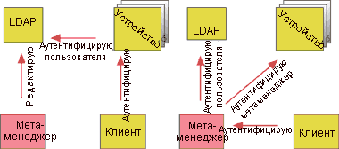 - Реализация посредством стандартизированных служб аутентификации и авторизации: наиболее часто используются LDAP и RADIUS. Когда пользователь обращается к конкретному устройству доступа, оно осуществляет аутентификацию при помощи одной из этих служб. Кроме того, обе службы позволяют хранить в учетной записи дополнительные данные, которые также могут учитываться при аутентификации. Службы могут, но не должны быть неотъемлемыми составными частями метаменеджера. Если они ими не являются — например, дополнительно должны задействоваться уже имеющиеся службы и их данные, — метаменеджер часто функционирует лишь в качестве пользовательского интерфейса для изменения данных в службах.
