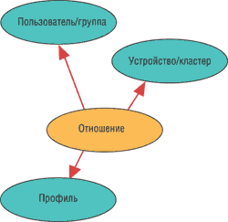 - Отношение — это логическое связывание трех первых объектов. Оно связывает пользователя или группу, устройство или кластер и профиль.