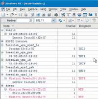 | Рисунок 2. Анализатор беспроводных сетей Airopeek NX 2.05 от Wildpacket хотя и сообщал о точках доступа с множественными SSID, однако интерпретирует все как TKIP. |