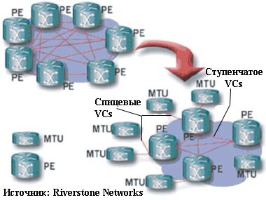 С помощью иерархических VPLS (HVPLS) можно строить двух- и трехуровневые иерархические сети. В области доступа используется новый класс коммутаторов MPLS: коммутаторы для зданий, где размещается множество арендаторов (Multi-Tenant Unit, MTU). MTU задуманы таким образом, что для их работы необходимо ограниченное число функций MPLS. Это позволяет создавать недорогие и легко управляемые устройства. Коммутаторы MTU собирают трафик данных в прямые соединения Martini или вложенные виртуальные соединения Q-in-Q (см. Рисунок 2), которые терминируются на маршрутизаторах VPLS PE. Вместо построения целостной сети из MTU, провайдеру нужно связать маршрутизаторы VPLS PE между собой и подключить к ним MTU (пограничный маршрутизатор РЕ).