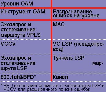 | Таблица 1. Типы распознавания ошибок с помощью различных инструментов MPLS OAM. |