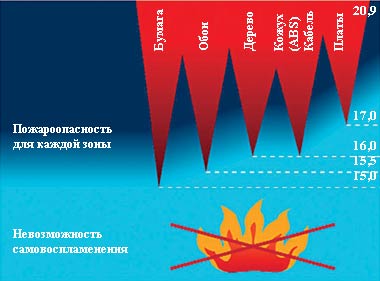В последние годы на рынке получила признание еще одна концепция противопожарной защиты, которая по причине достижимого высокого уровня защиты от огня особенно хорошо подходит для вычислительных систем с их чувствительной техникой. При этом на передний план выходит не скорейшее выявление и тушение пожара, а его предотвращение. Основной принцип прост. Для всех твердых веществ имеет силу одно правило: их воспламеняемость напрямую зависит от содержания кислорода в окружающем воздухе, и при уменьшении его концентрации она снижается до нуля. Для предотвращения воспламенения содержание кислорода в окружающем воздухе должно быть снижено до 13—17% объема в зависимости от класса пожара. При концентрации около 15% от объема в случае большинства жидких или твердых веществ возможность появления открытого огня полностью исключается. Платы, кожух и кабель не воспламеняются при содержании кислорода менее 17% (см. Рисунок 2).