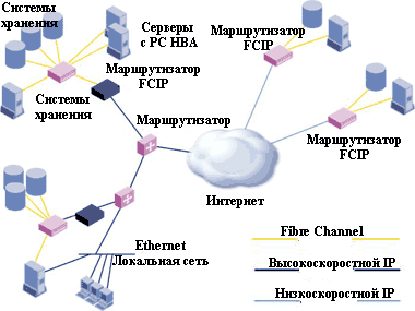 Свидетельством зрелости технологии Fibre Channel стала разработка протоколов Fibre Channel поверх IP (FCIP) и Internet Fibre Channel Protocol (iFCP). FCIP осуществляет инкапсуляцию Fibre Channel и туннелирование по сетям IP, что обеспечивает возможность соединения различных сетей хранения данных через глобальные сети (см. Рисунок 4). В свою очередь, протокол iFCP предназначен для передачи данных между мостами FCIP.