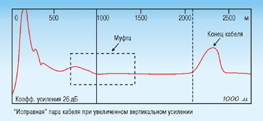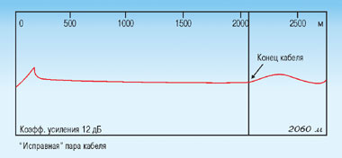 При проверке получаем две рефлектограммы одной и той же пары (при снятии рефлектограмм использовались разные коэффициенты усиления). В первом случае при коэффициенте усиления в 12 дБ на рефлектограмме исправной пары наблюдается всплеск положительной полярности на расстоянии 2060 м, что соответствует концу данного кабеля в распределительном шкафу. Во втором — при увеличении коэффициента усиления на 14 дБ на рефлектограмме появляется дополнительный всплеск, характер которого указывает на наличие муфты в кабеле на расстоянии 1000 м. При дальнейшем повышении уровня усиления по вертикали на рефлектограмме не будет выявлено ни малейшего повреждения вдоль всей длины тестируемого кабеля.