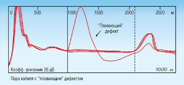 «Плавающие» дефекты — это периодически проявляющиеся повреждения, причинами которых могут быть некачественные соединения жил или пониженное сопротивление изоляции. О дефектах такого рода свидетельствуют жалобы клиентов на повышенный шум линии или кратковременное пропадание сигнала «ответ станции». Такие дефекты могут проявляться при подаче вызывного напряжения, при механическом воздействии на кабель в месте повреждения (например, в случае вибрации от проходящего рядом трамвая или какого-либо работающего оборудования) и т. п.