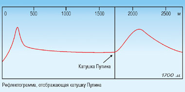 Как можно заметить, очертание импульса, отраженного от пупиновской катушки, более округлое по сравнению с очертанием импульса, отраженного от обрыва кабеля, а сама катушка находится на расстоянии около 1700 м. В России существует несколько систем пупинизации: средняя, легкая, очень легкая и легкая радиовещательная. Все системы имеют одинаковый шаг пупинизации 1,7 км и отличаются индуктивностью катушек, полосой передаваемых частот и расстоянием между усилителями. К сожалению, на рефлектограмме видна только первая катушка.