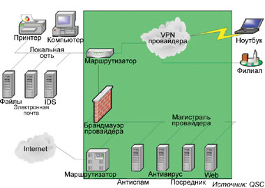 | Рисунок 1. Управляемая безопасность на базе клиента: внешний провайдер услуг обслуживает инфраструктуру безопасности предприятия. |