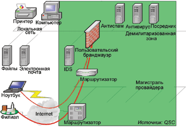 Для реализации системы обеспечения безопасности ИТ предприятию необходимо инсталлировать в своем вычислительном центре все системы безопасности — брандмауэр, доступ через VPN с использованием IPSec, фильтры вирусов и спама, proxy-сервер — и заниматься их поддержкой самостоятельно («инсорсинг»). Такой подход ведет как к максимальной управляемости и гибкости, так и к неизбежному росту инвестиций и стоимости эксплуатации. Значительный технический недостаток заключается в том, что пропускная способность соединения с Internet абсолютно незащищена. Распределенная атака с целью «отказа в обслуживании» (Distributed Denial of Service, DDoS) или большая волна вирусных спамовых писем ведет к перегрузке либо канала связи с провайдером, либо сервера Web или электронной почты. Таким образом, атака, несмотря на все меры безопасности, все же будет успешной.