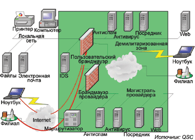Лишь комбинация управляемой безопасности на базе пользователя и провайдера (см. Рисунок 3) позволяет достичь оптимума: сетевой брандмауэр и размещенные у провайдера вирусный и спамовый фильтры защищают каналы и серверы от атаки DDoS, спама или вирусов. Инсталляция же управляемого брандмауэра у клиента позволяет организовать демилитаризованную зону, а применение управляемых фильтров спама на месте — адаптироваться к конкретным потребностям предприятия. Управляемый фильтр вирусов создает дополнительный уровень обороны в многоступенчатой концепции защиты от вирусов.