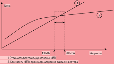 Игорь Андрющенко, руководитель департамента инженерных систем компании «Копитан», считает, что разбиение на трансформаторные и бестрансформаторные модели обосновывается, в конечном счете, экономическими соображениями. Если стоимость бестранформаторных источников при мощностях до 150б-200 кВА ниже, чем трансформаторных, то в случае превышения этого порога ситуация меняется на противоположную (см. Рисунок 2). К сожалению, добавляет он, некоторые компании уже перестали поддерживать модельные ряды трансформаторных источников при мощностях ниже 150 кВА, оставив только бестрансформаторные модели, в результате чего заказчик лишается свободы выбора. Новые модели выпускаются с прицелом на максимальную эффективность с точки зрения соотношения цена/мощность. Поэтому на малых мощностях уже не выпускаются новые трансформаторные модели, а на больших б- пока не разрабатываются бестранформаторные.