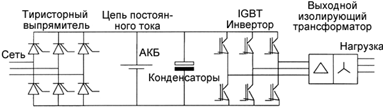 | Рисунок 1. Схема построения трансформаторного ИБП (с двойным преобразованием). |