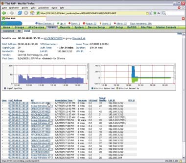 Платформа управления Airwave предоставляет не только обзор статуса управляемых точек доступа, но и обзор активности клиентов WLAN во всей системе. По каждому клиенту АМР сохраняет требующие анализа данные в истории сеансов. К этой информации относятся точки, через которые осуществлялся доступ, время доступа, длительность сеанса, переданный объем данных и качество сигнала. Обычно АМР идентифицирует клиентов по их МАС-адресу. Если точки доступа, коммутаторы или маршрутизаторы путем запроса по SNMP таблицы ARP позволяют узнать IP-адрес по МАС-адресу, фиксируется и он (проверено при помощи управляемого коммутатора D-Link DES-3526). Вместе с учетной информацией доступного сервера RADIUS (по данным Airwave, он должен функционировать с Free Radius и Radiator) из истории клиента WLAN путем добавления регистрационного имени получается запись поведения пользователя, из которой фрагментарно можно выяснить, кто на предприятии находился, когда и где (см. Рисунок 2).
