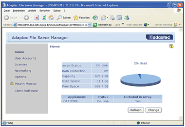 Для запуска ESA 1500 File Saver устройство было подключено к тестовой сети. После чего на Windows 2003 Server установили File Server Manager 5.3.0, посредством которого производится управление. Программное обеспечение автоматически распознает все имеющиеся в данной физической подсети системы ESA и показывает их IP-адреса. Адреса сообщаются, даже если в соответствии с конфигурацией управляющий компьютер имеет IP-адрес из другой подсети IP. Затем Windows 2003 Server был присвоен IP-адрес из той же подсети, в которой находилось устройство, чтобы к ESA 1500 можно было обращаться через браузер при помощи File Server Manager.