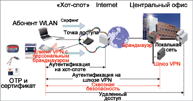 Для безопасного доступа через общественные точки доступа («хот-спот») необходимо решение, защищающее удаленное рабочее место во всех фазах построения соединения - без рискованных жестко заданных настроек и участия пользователя. Этого можно добиться при помощи комбинации виртуальной частной сети (Virtual Private Network, VPN), надежной аутентификации, шифрования данных и брандмауэра.
