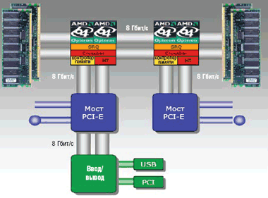 | Рисунок 3. Платформа AMD64 на основе архитектуры Direct Connect реализует технологию HyperTransport, обеспечивающую высокую пропускную способность шины с минимальным временем отклика. Она свободна от узких мест классической шины FSB. |