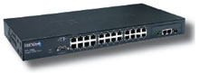 До 16 коммутаторов можно объединить в стек и управлять через один IP-адрес. Для удаленного управления IP-адрес должен быть доступен извне. Кроме того, на брандмауэре/маршрутизаторе необходимо открыть порт 80/28019. Конфигурация осуществляется через консольный порт, посредством SNMP (v1.0, MIB II), telnet и браузера Web. Коммутатор имеет встроенный буфер пакетов объемом 3 Мбайт и контрольный буфер емкостью 1 Мбайт. Он сохраняет до 6 тыс. MAC-адресов, поддерживает до 6 тыс. VLAN и до 2 тыс. многоадресных рассылок.