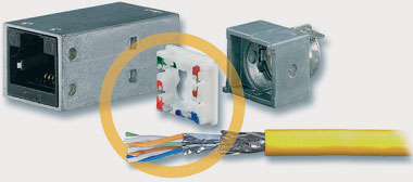 | Рисунок 2. Экранированная кабельная система для поддержки передачи сигналов 10 Gigabit Ethernet на расстояние 100 м: горизонтальный кабель и розеточный модуль. |